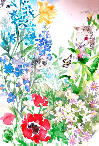 我が家の庭の花をモチーフに、flemyさんが水彩画を描いてくださいました。 印象的な赤いオニゲシ(あえてオリエンタル・ポピーとは呼ばない笑)をはじめ、デルフィニウムやブラキカム、チョウジソウetc…なんと、『オオシロオビクロナミシャク』まで! まるで…