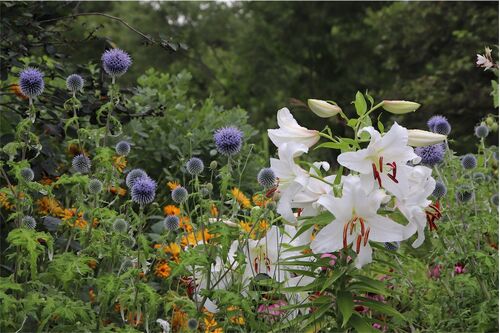 もう朝晩すっかり涼しくなり、庭も秋の気配が濃くなってきました。 白いカサブランカ、紫のルリタマアザミ、黄色のヘリオプシス・ブレッシングハムダブロン 奥は真っ白から退色したアナベルのグリーン、手前は咲き始めのノリウツギのグリーン、これからピン…